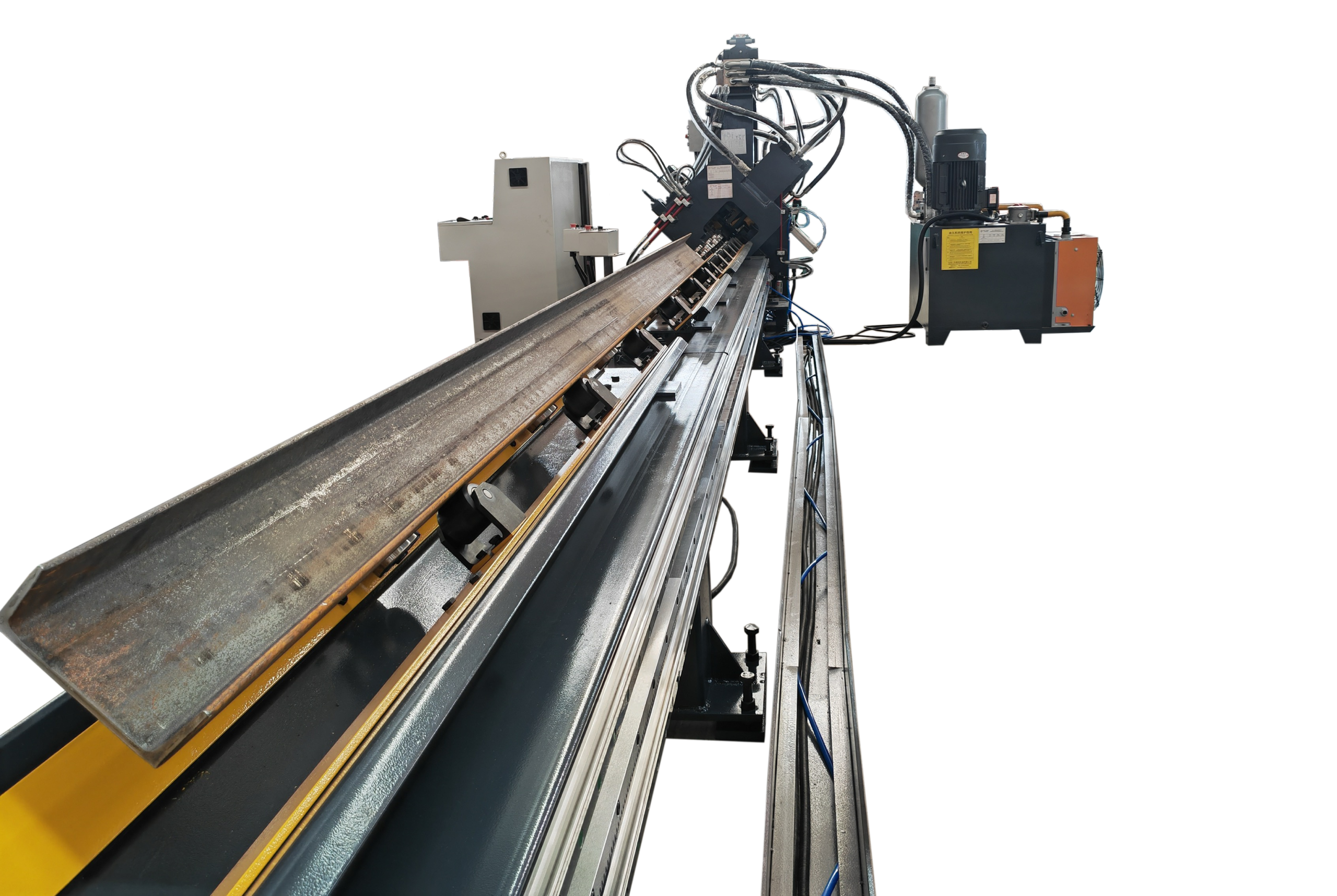 ЧПУ‑линия для уголков, полосы и швеллеров: автоматические операции маркировки, сверления (пробивки) и резки в одном цикле для деталей ЛЭП, связи и строительных металлоконструкций. Подача сервокареткой, полный автомат от захвата заготовки до выгрузки готовой детали.