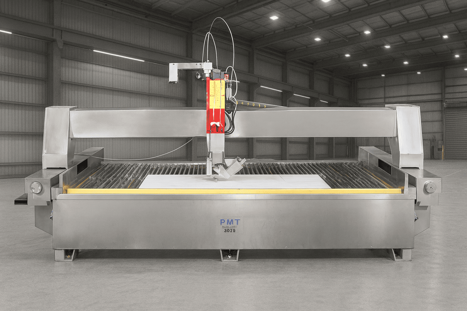 Гидроабразивный станок PMT 5 осей используем для сложных вырезов и фигурных вставок. Для дорогого материала это спокойнее, чем резать диском.